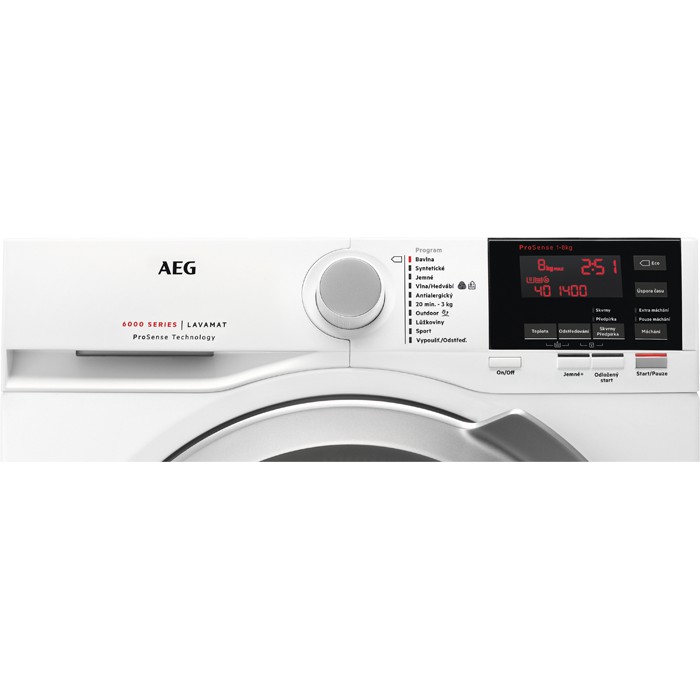 AEG L6FBG68SC ProSense® pračka, kapacita praní 8 kg, 1600 otáček, A+++-30 % - Pračka předem plněná - hluboká; AEG ProSense™ L6FBG68SC; Hlavní technologie: ProSense™; En. třída: A+++-30 %; Kapacita praní (kg): 8; Otáčky za minutu: 1600; Hlučnost (db): 50; Aqua control: Ne; Parní programy: Ne; Time Manager/úspora času: Ano; Antialergický program: Ano; Rychlý program: Ano - 20 minut/3kg; Woolmark: Blue; Rozměry VxŠxHxH max. (mm): 850x600x575x600; Motor: Ökoinvertor motor s doživotní zárukou; Displej: LED displej; Odložený start: Ano; Český panel a popisky: Ano; 5 let záruka na celý model: Ano