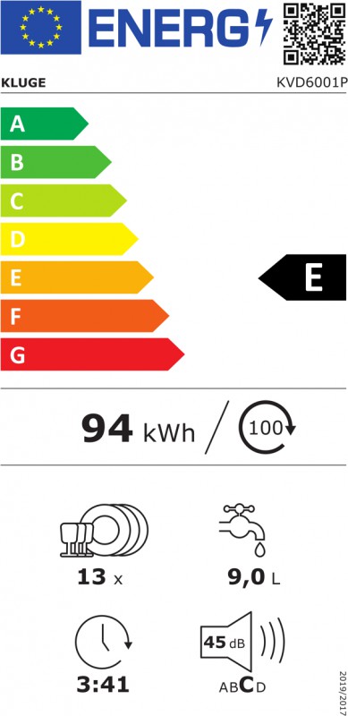 * Kapacita 13 sad nádobí; Energetická třída E ● 9 mycích programů / 5 teplot; Bílý LED displej, elektronická tlačítka; EcoWash – mytí poloviční náplně (3 režimy); Mini Active Drying - úsporný a tichý systém sušení; Odložený start mycího programu až o 19 hodin.; Zásuvka na příbory Eco Tray, plně sklopné moduly ve spodním koši; Soft touch – měkčené držáky na sklenice v horním koši; Bezpečnostní hadice Aquastop; Hlučnost 45 dB • Spotřeba energie (100 cyklů) / vody (cyklus): 94 kWh / 9 l; Rozměry (V x Š x H): 82-87 x 59,8 x 57 cm